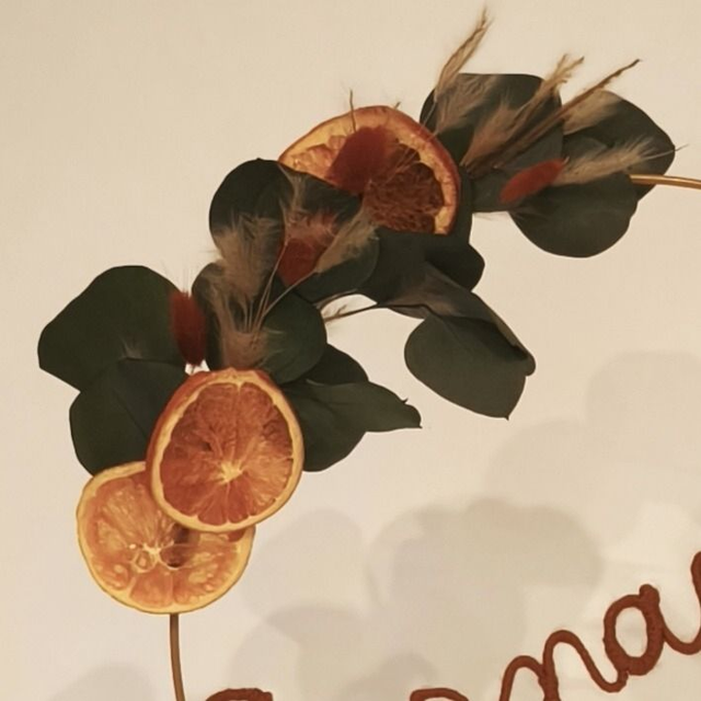 Cette couronne de 30 cm de diamètre associe avec élégance des oranges séchées, un feuillage vert profond et une inscription “Carnaval”, pour une création à la fois joyeuse, chaleureuse et originale.
